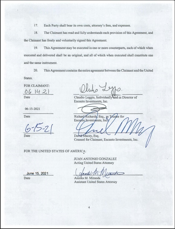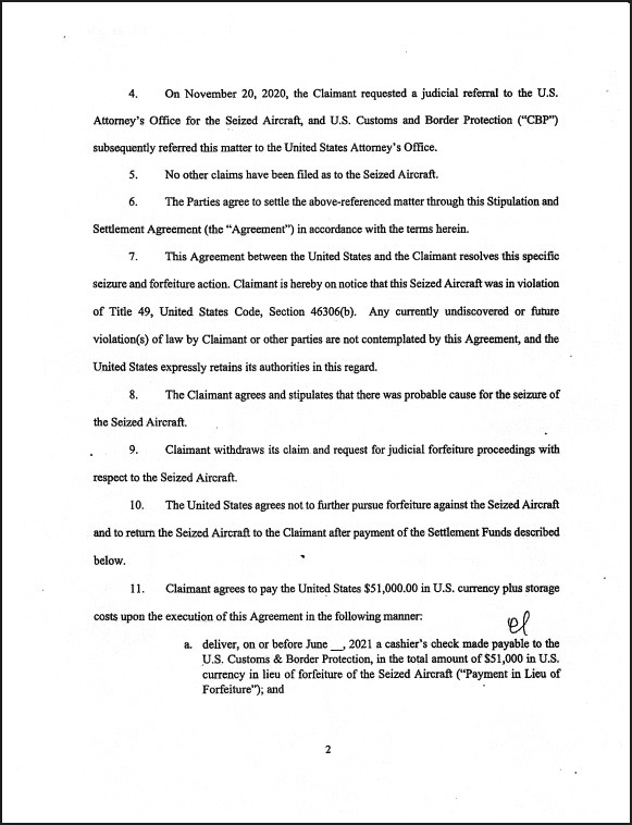 La resolución del caso se alcanzó de manera amistosa en junio de 2021, mediante la firma de un acuerdo de estipulación y liquidación ante la Fiscalía Federal del Distrito Sur de Florida. En dicho documento, el fideicomiso —bajo la representación de Encanto Investments, Inc.— aceptó la causa probable de la retención inicial y optó por desistir de cualquier reclamo judicial de decomiso, priorizando una vía de solución eficiente y transparente para regularizar la situación de la aeronave.
